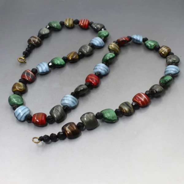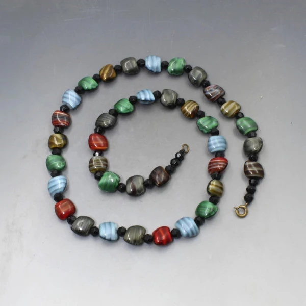 Lovely vintage Venetian multi colour glass bead necklace. The set measures approximately 24 inches (61 cm) and has a gold tone spring ring clasp closure. The stripey coloured beads measure approximately 1.2 x 1 cm.. Weight is 59 grams. The set is in very good condition. Condition: Very Good Colour/Gemstone: Venetian glass beads - multi colour Metal: Gold Tone Weight: 59 grams