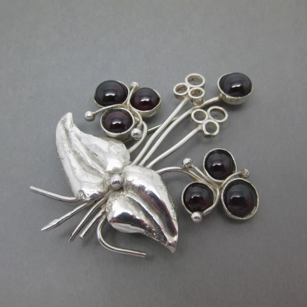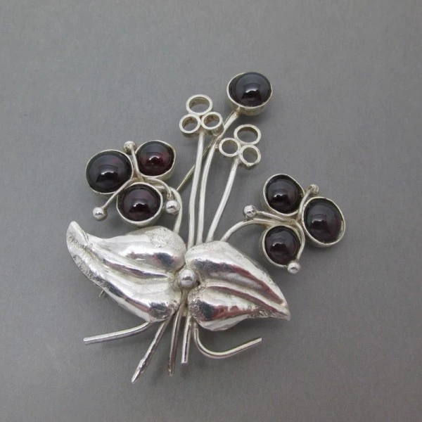This is a very rare and beautiful quality sterling silver and garnet gemstone brooch by Vera Dorothy Corstorphine. It has a lovely sterling silver flower bouquet design with seven circular dark red garnets in sterling silver settings . The rear of the brooch has a sterling silver pin with a C type rollover closure. The rear of the brooch is signed with "VDC" and has silver hallmarks for Edinburgh 1987. The brooch measures approximately 6 cm x 4.8cm (at the widest part) approximately and is in very good condition.