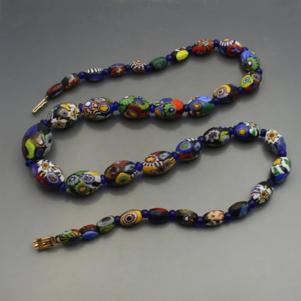 Stunning vintage Venetian millefiori bead necklace. The set is graduated in size with the largest oval bead measuring approximately 3 x 1.9 cm. The colourful milliefiori beads are lovely quality with small dark blue glass beads in between the large beads. The set measures approximately 27.5 inches (70 cm) long and has a gold tone box clasp closure. Weight is 124 grams. The set is in very good condition.
