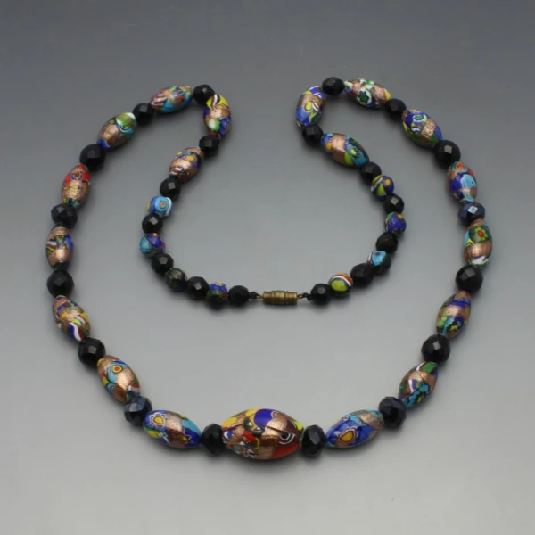 Beautiful multi coloured vintage Venetian millefiori bead necklace. The set is graduated in size with the largest oval Venetian glass bead measuring approximately 2.6 x 1.7 cm. The colourful millefiori beads are lovely quality with smaller facted black glass beads in between the large beads. The set measures approximately 27 inches (68 cm) long and has a gold tone barrel clasp closure. Weight is 87 grams. The set is in very good condition.