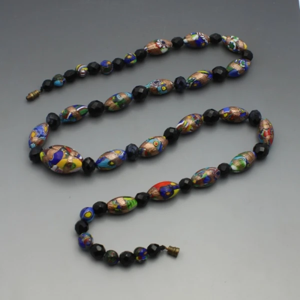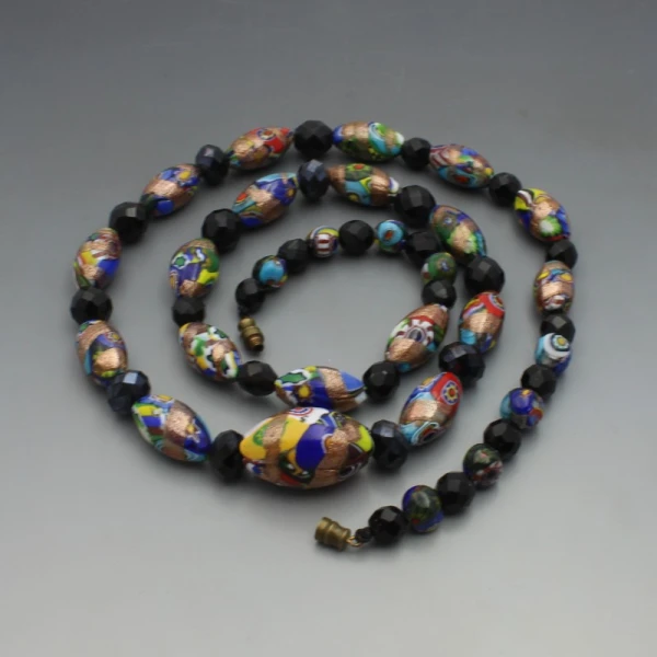 Condition: Very good condition Colour: Multi coloured Venetian glass oval beads with black glass beads Metal: Gold Tone Size: 27 inches (68 cm) long x 1.7 cm wide Era: