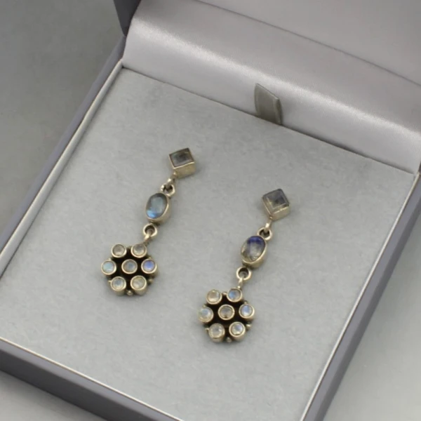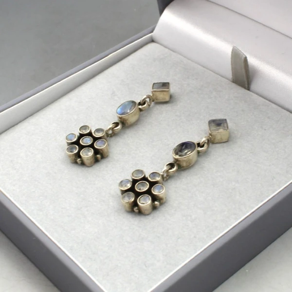 Lovely quality vintage moonstone and sterling silver drop earrings with floral design. The small faceted moonstone gems are bezel set in sterling silver settings and the earrings have sterling silver stud and post fittings for pierced ears. The earrings each measure approximately 4 cm long x 1.2 cm wide. They are marked "925" on the rear. Weight is 10 grams. They are in very good condition.