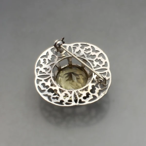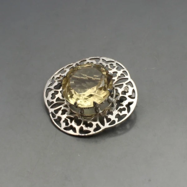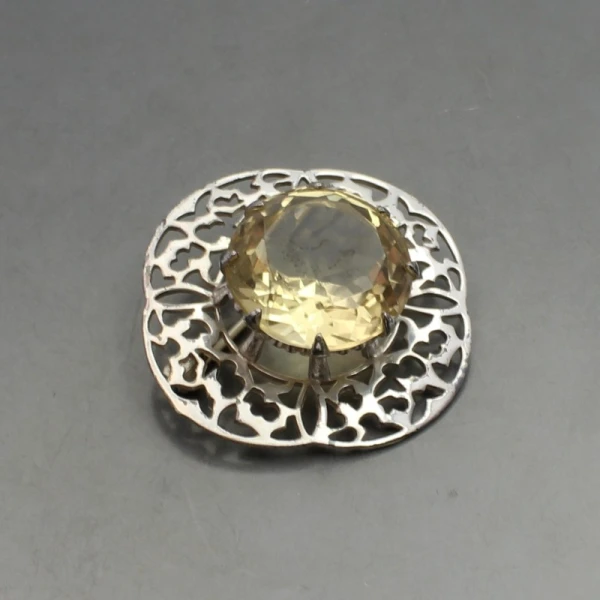 Vintage large H Wright and Sons citrine and sterling silver art nouveau style brooch. . It has a pin and rollover C clasp closure to the rear. It is signed "H W & S", and has silver hallmarks for Edinburgh 1955 on the rear. The brooch measures approximately 5.6 cm in diameter. Weight is 24..