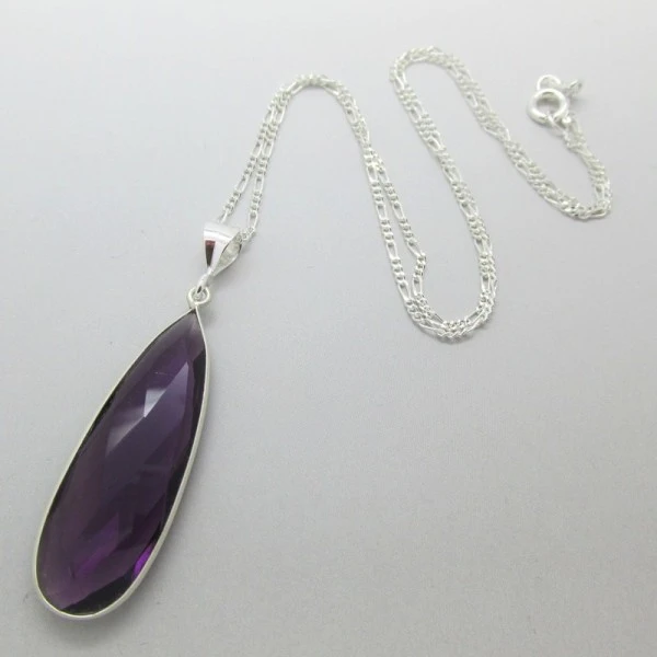 This stunning necklace has a large amethyst pendant with a beautiful colour to it. The purple amethyst stone is faceted, and has a sterling silver setting.T he pendant has a sterling silver pendant bail, and a sterling silver figaro chain. The amethyst pendant measures approximately 3.6 cm x 1.4 cm and the sterling silver chain length measures approximately 16 inches (41cm) long.