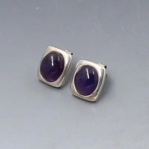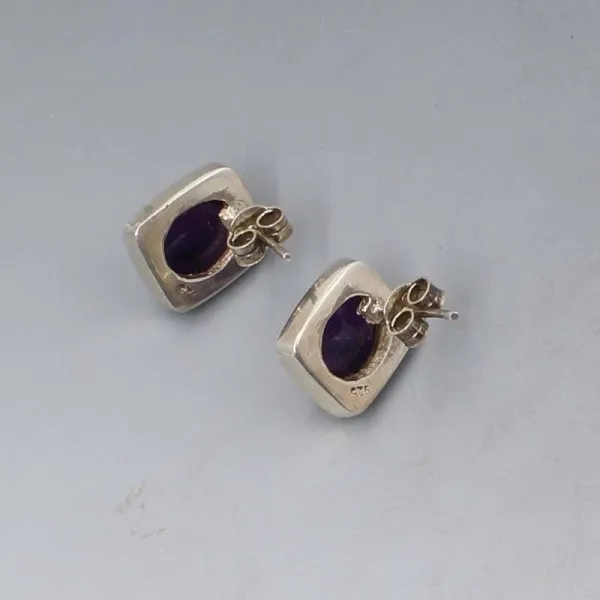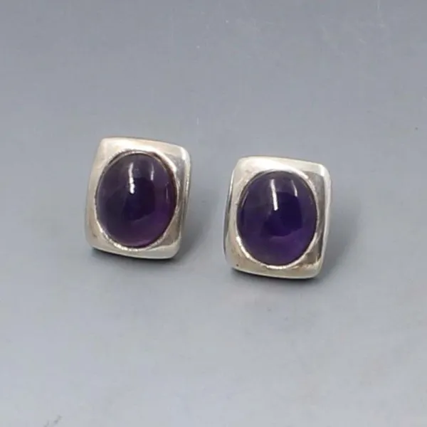 Lovely solid vintage amethyst and sterling silver earrings. Each of the oval amethyst gems is bezel set in rectangular solid sterling silver open backed settings. The earrings have sterling silver post and butterfly fittings for pierced ears. Each earring measures approximately 1.4 x 1.2 cm. They are marked "925" on the rear. Total weight is 9 grams. This is new old stock in very good condition.