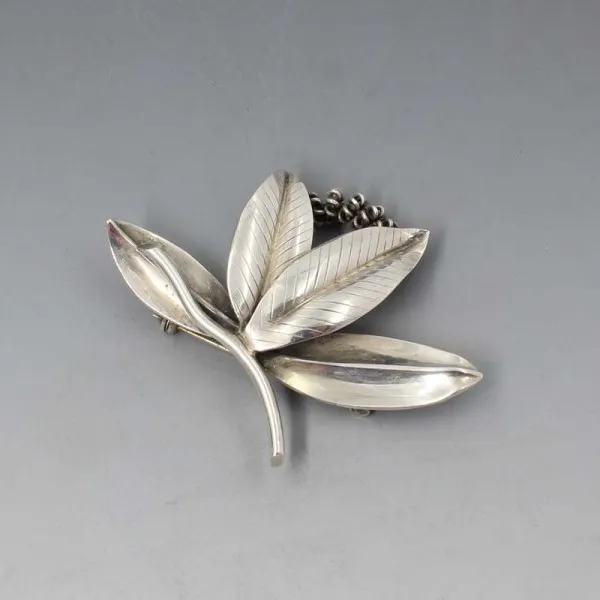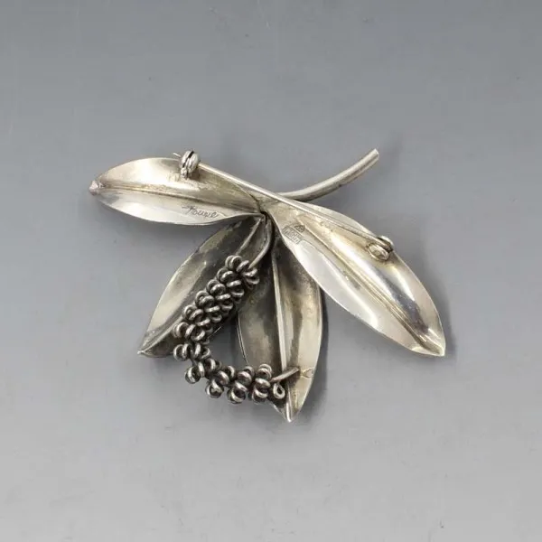 Beautiful vintage Georg Jensen sterling silver brooch with leaf and hanging grapes design. It has a pin and rollover C clasp to the rear. It it signed "GEORG JENSEN SILVERSMITHS LTD", "925S", "STERLING DENMARK" and "217B" . It is in very good condition. The brooch measures app..