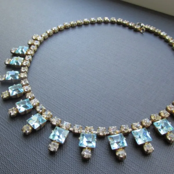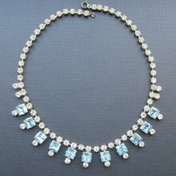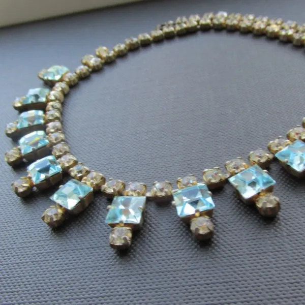 This is a lovely vintage crystal Art Deco style necklace. It is made entirely of clear diamante crystals and square blue aquamarine crystals. The sparkling crystals are all prong set in silver tone settings. The necklace has a spring ring necklace fastening and the necklace measures approximately 15.5 inches (39.5cm) long. Each aquamarine crystal square measures approximately = 0.75 x 0.75 cm . The necklace is in good vintage condition.