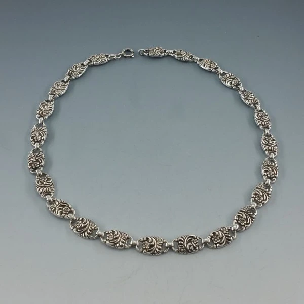 Lovely art deco style 835 silver links necklace with detailed floral and leaf design. It has a spring ring clasp fastening and measures approximtaely The necklace measures approximately 17 inches (43 cm). It is in very good condition. Weight is 25.3 grams.