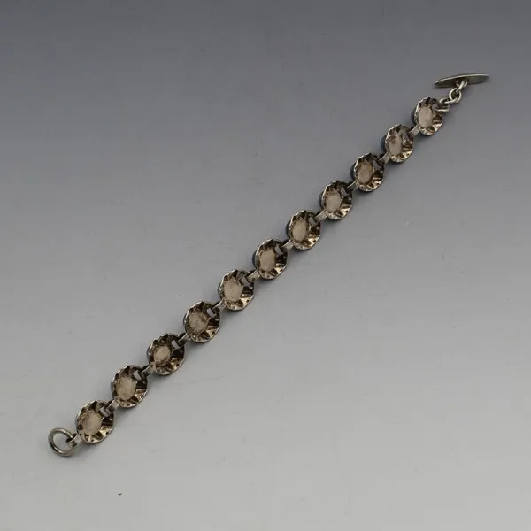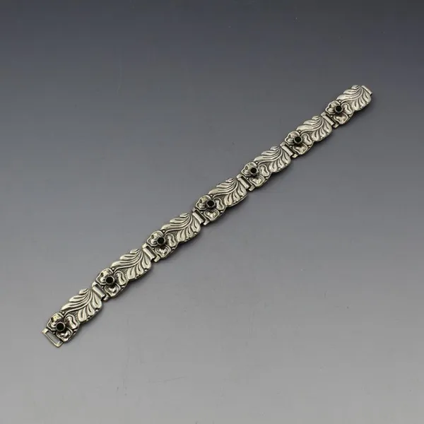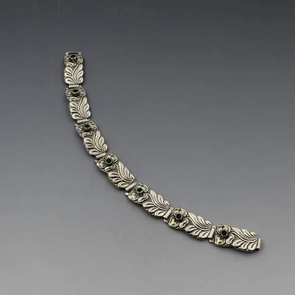 Beautiful Bernard Hertz, Denmark , 830 silver floral links bracelet with small round green chrysoprase details and a flat hook clasp closure. It is signed with the makers mark "BH" and "830.S". 830 is a Scandinavian standard of silver used until the 1970's. It is a slightly lower grade (approximately 10 %less) than sterling silver. The bracelet measures approximately 18 cm (7.25 inches). Weight is 18.8 grams. It is in very good condition. Estimated to date from the 1940's to 50's.
