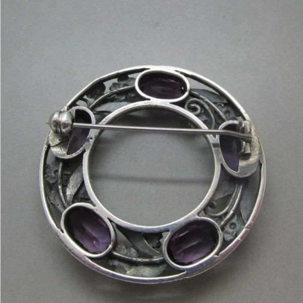 Beautiful quality Bernard Instone Arts and Crafts style faceted amethyst and sterling silver vintage brooch. The side of the brooch is marked with " SILVER" . It has silver hallmarks for Birmingham 1967 and is signed S & Co.The brooch is in excellent condition and measures approximately 4cm in diameter. It has a silver pin and rollover "C" clasp closure to the rear.