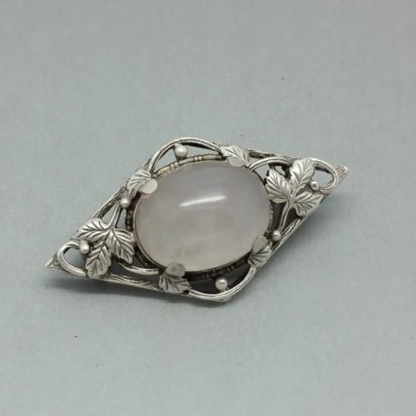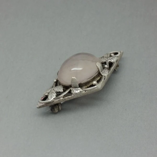 Lovely Bernard Instone and Arts and Crafts style rose quartz cabochon and sterling silver vintage brooch. The side of the brooch is marked with "SILVER". The brooch is in very good condition and measures approximately 4.1 cm x 2.2 cm It has a silver pin and rollover "C" clasp closure to the rear.