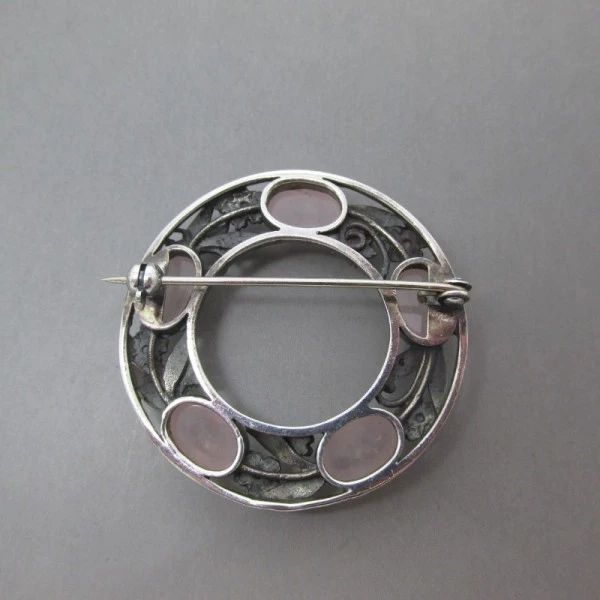 Top quality Bernard Instone Arts and Crafts style rose quartz cabochon and sterling silver vintage brooch. The side of the brooch has silver hallmarks for Birmingham 1990.The brooch is in very good condition and measures approximately 4cm in diameter. It has a silver pin and rollover "C" clasp closure to the rear.