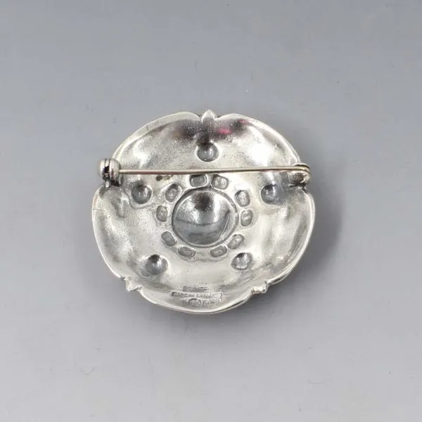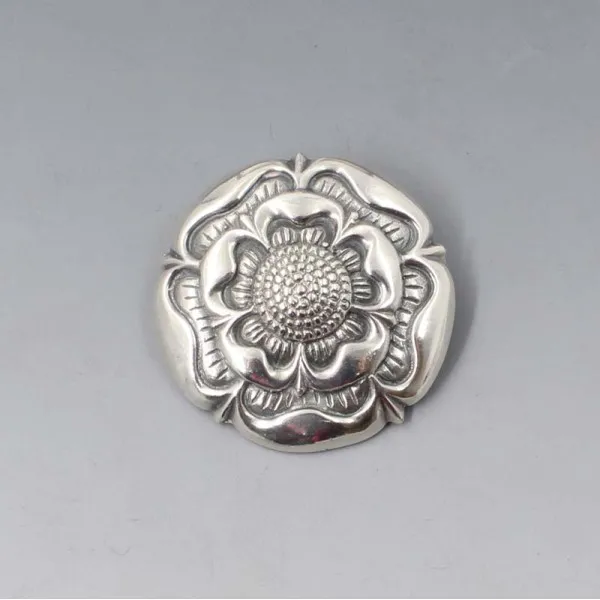Bernard Instone sterling silver flower brooch. It is cast in the form of a Tudor rose. The brooch is signed "SILVER MADE IN ENGLAND" , has makers marks BI, and silver hallmarks for Birmingham 1951. It measures approximately 3.8 cm in diameter and has a rollover clasp and pin closure to the rear. Weight is 17.1 grams. It is in very good condition Condition: Very good Colour: Silver Metal: Sterling Silver Size: 3.8 cm diameter approximately Era: 1951