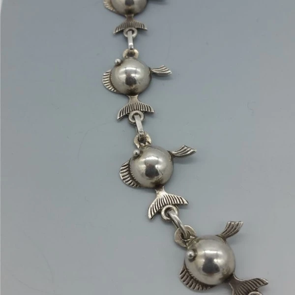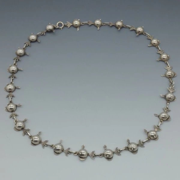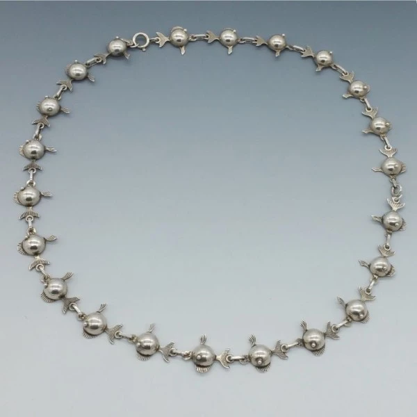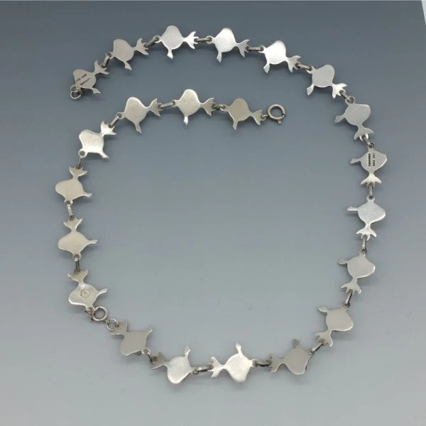 Rare Carl Ove Frydensberg, Denmark, sterling silver fish necklace. This is a beautifully detailed silver link necklace. It is signed with the makers mark "COF" and "STERLING DENMARK". on the rear. It has a spring ring clasp closure and measures approximately 58 cm ( 22.5 inches ). Weight is 36.2 grams. It is in very good vintage condition with only very small signs of wear commensurate with age. It is estimated to date from the 1950's to 1960's