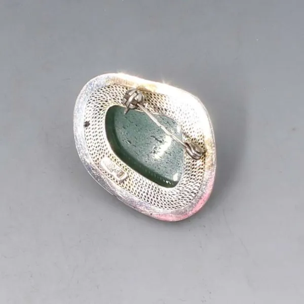 Vintage moss agate and sterling silver brooch. The moss agate is bezel set within a decorative open backed sterling silver setting and the brooch has a sterling silver pin and C clasp closure to the rear.The brooch measures approximately 2.7 x 2 cm approximately. Weight is 7 grams. ..