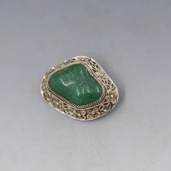 Lovely vintage Chinese sterling silver and jade brooch. The central jade cabochon is set in a detailed openbacked sterling silver filigree setting. The rear of the brooch has a sterling silver pin and rollover clasp closure. It is marked "SILVER" on the rear. It measures approximately 3.8 x 2.8 cm long. Weight is 11 grams. It is in very good condition Condition: Very good Colour: Silver, jade Metal: Sterling Silver Size: 3.8 x 2.8 cm Era: Estimated 1970's to 80's