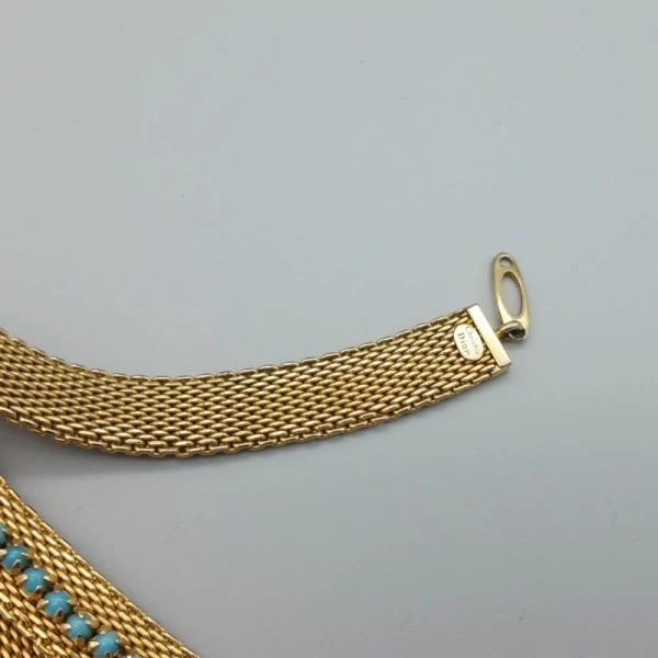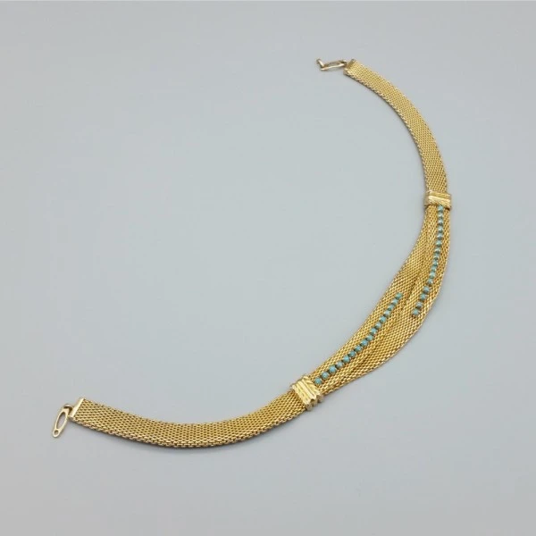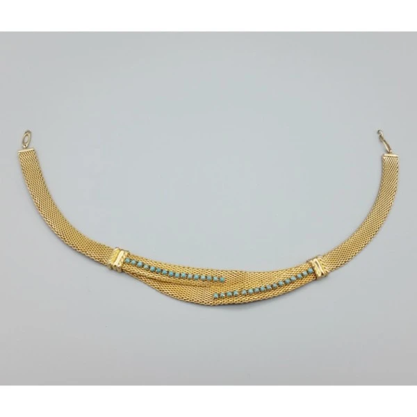Vintage Christian Dior choker necklace with faux turquoise details on a flat gold tone chain with small hook type closure.The rear of the necklace is marked Christian Dior near the closure. This is a short choker necklace measuring 13.75 inches (35cm) and is suitable for those with slim necks. The necklace is in very good condition. Condition: Very Good Colour/Gemstone: Faux turquoise beads Metal: Gold Tone Size: 13.75 inches (35 cm ) x 1cm wide Era: 1980's
