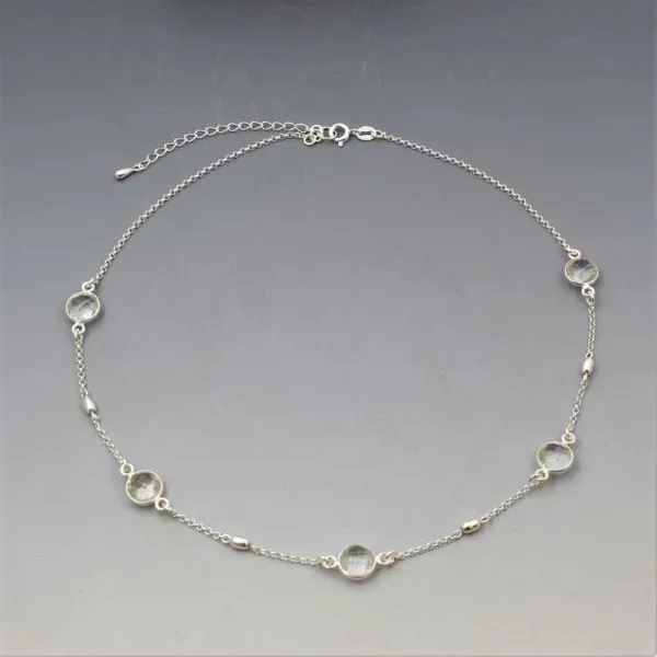 Sparkling round real crystal quartz necklace in sterling silver. It has five round faceted clear crystal quartz gems bezel set in sterling silver settings, interspersed with small oval silver beads .The sterling silver chain is adjustable between 41cm to 46 cm (16 to 18 inches) and is finished with a small charm.