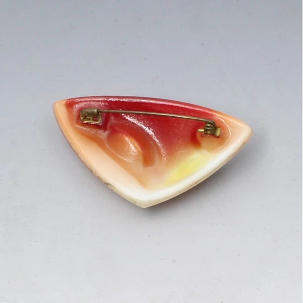 Condition: Very good with small signs of wear commensurate with age. Colour: Red/pale orange/yellow Metal: Size: 6 cm x 3.4 cm approximately Era: Estimated 1950's