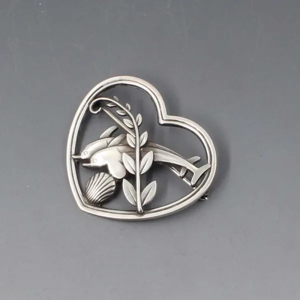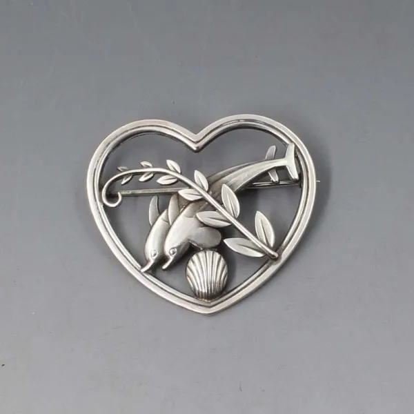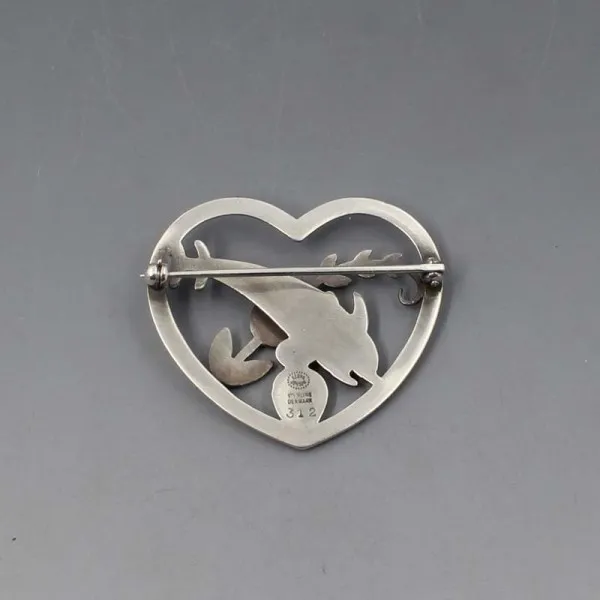 A vintage sterling silver dove brooch by Georg Jensen. It features a dove perched on top of a laurel wreath. The rear of the brooch is marked with "Georg Jensen Sterling Denmark 191" . It has a rollover C clasp and pin closure on the rear. It measures appr..