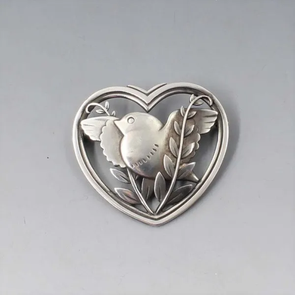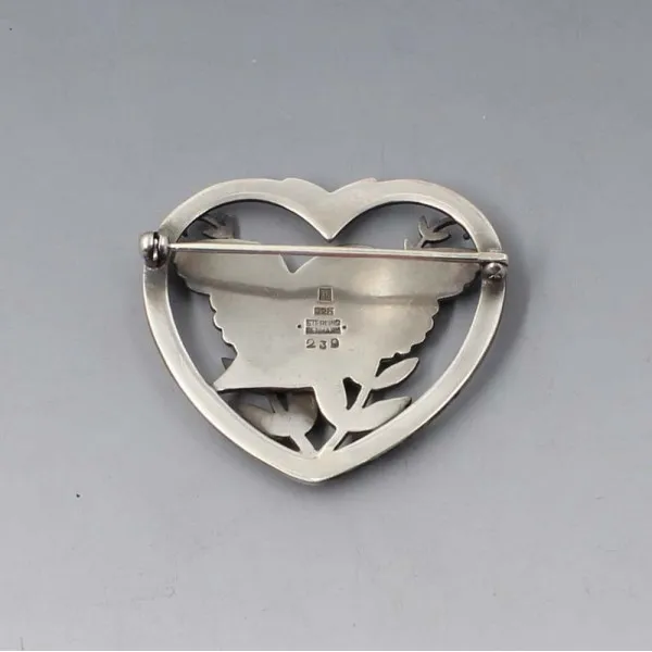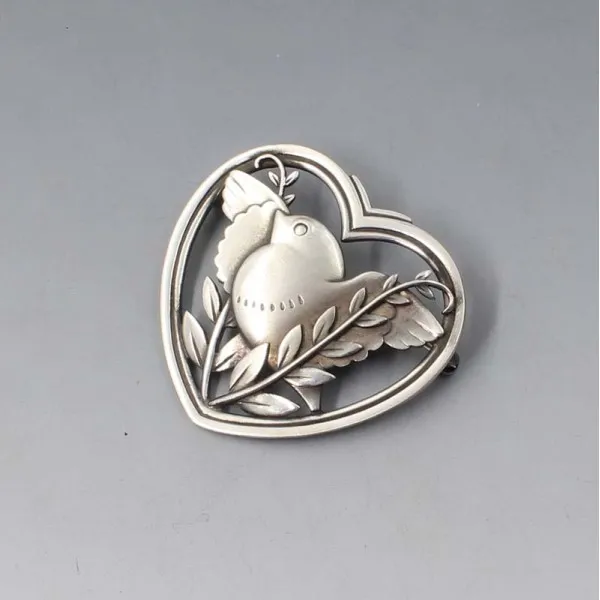 Very beautiful vintage Georg Jensen sterling silver dove in heart brooch with foliage.