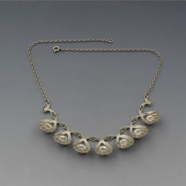 Pretty Danish Hermann Siersbol vintage sterling silver and pink chalcedony floral necklace and earrings. The necklace has seven chalcedony gems bezel set in decorative silver petal type settings. It is signed "STERLING DENMARK HS" on the rear. It has a 15.5 inch (39.5 cm) sterling silver chain with spring ring clasp closure. It is a short necklace, almost a choker style. Weight of necklace is 18.3 grams. The matching earrings each measure approximately 1.7 x 1.5 cm (not including the ear hooks). The necklace and earrings are in very good condition and are estimated to date from the 1950's to 1960's. A matching bracelet is available and can be found here. Condition: Very good Colour: Silver and pink chalcedony Metal: Sterling Silver Size:15.5 inch (39.5 cm) chain approximately Era: 1950's to 1960's
