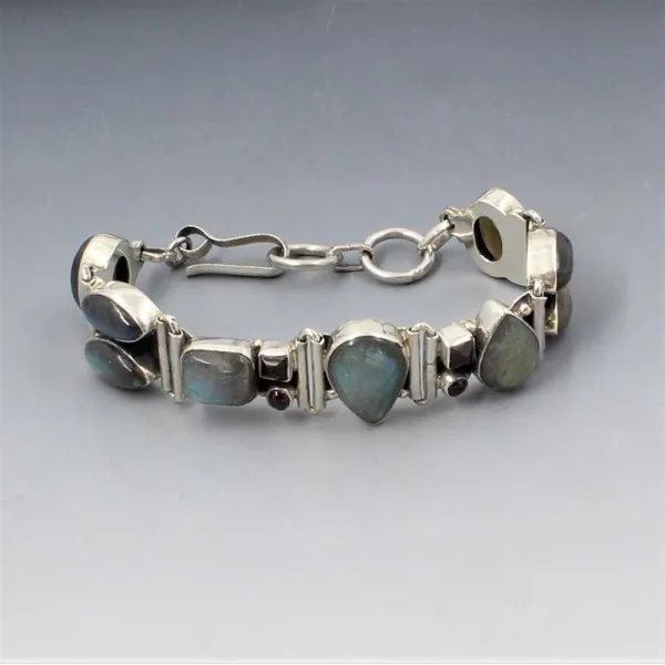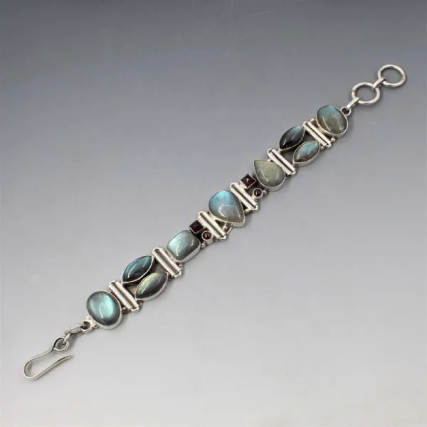 Stunning vintage labradorite, garnet and sterling silver bracelet. The mixed shape labradorite gems are beautiful quality with a lovely hue, and are bezel set in solid open backed sterling silver settings. Small garnet gems are situated beside the central pear shaped labradorite gem. The bracelet has a silver hook type closure and is marked "925"on the rear. It measures approximately 21 cm at full extension and can be closed between 18.5 to 21cm approximately. Weight is 40.9 grams. It is in excellent condition.
