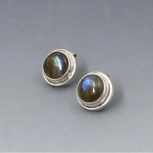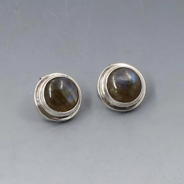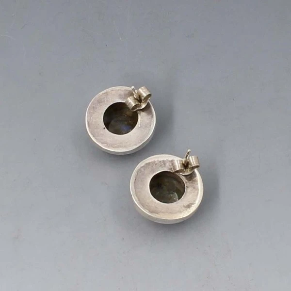 Vintage labradorite and sterling silver stud earrings. The labradorite gems are bezel set in circular sterling silver settings. The earrings have post and stud fittings suitable for pierced ears.The earrings each measure approximately 1.7 cm in diameter. Very good condition.