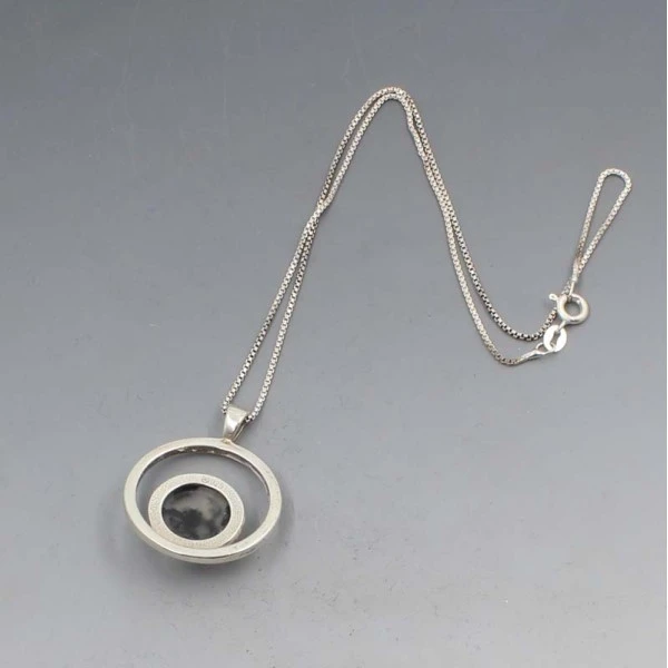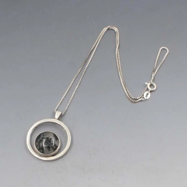 Malcolm Gray, Ortak, moss agate and sterling silver pendant and chain. It is signed "MG 925 " on the rear. The pendant measures approximately 2.6 cm in diameter. The chain measures approximately 15 inches (38 cm). Weight is 10 grams. It is in very good condition .