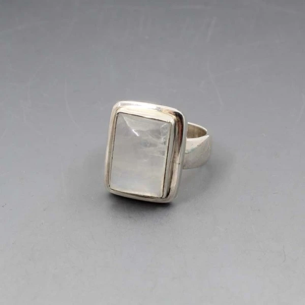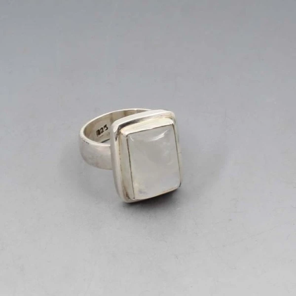 Vintage moonstone and sterling silver ring. The rectanular moonstone is bezel set in an open backed sterling silver setting. The ring is marked "925 " on the inside part. It is approximately a UK size Q or Q1/2. Weight is 12.3 grams. The moonstone measures approximately 1.6 x 1.2 cm. It is in very good condition Condition: Very good condition Colour/gemstone: Silver, Moonstone, Metal: Sterling Silver Size: UK Ring Size O1/2 or P Era: