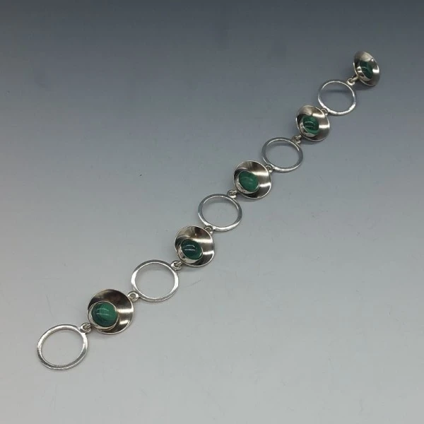 Condition: Very Good Colour/Gemstone: Malachite Metal: Sterling Silver Size: 19cm (7.25 inches) Weight: 16.0 grams Era: 1950's to 1960's