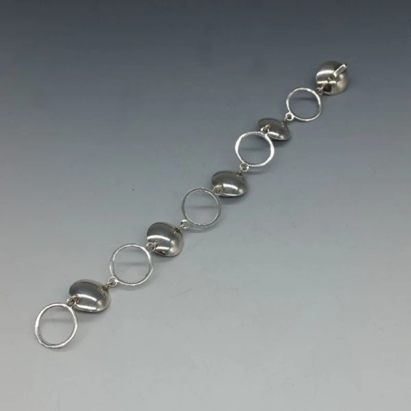 Long sterling silver "Pebbles" station necklace. It has a mixture of oval shaped beads with a textured finish and small round silver beads on a sterling silver chain.The chain has a spring ring closure. The larger oval beads measure approximately 1.3 x 0.9 cm. The necklace measures approxi..