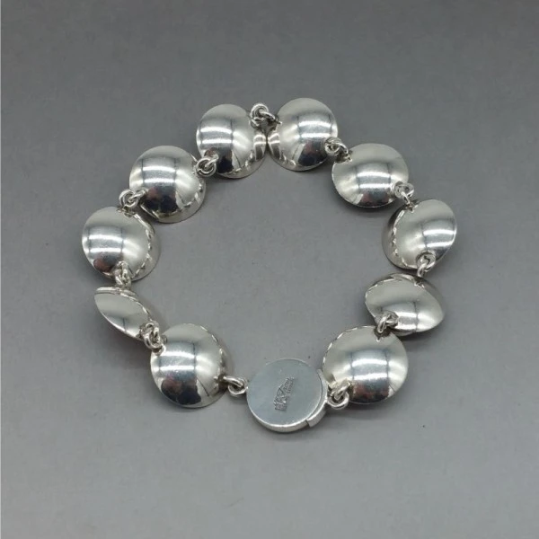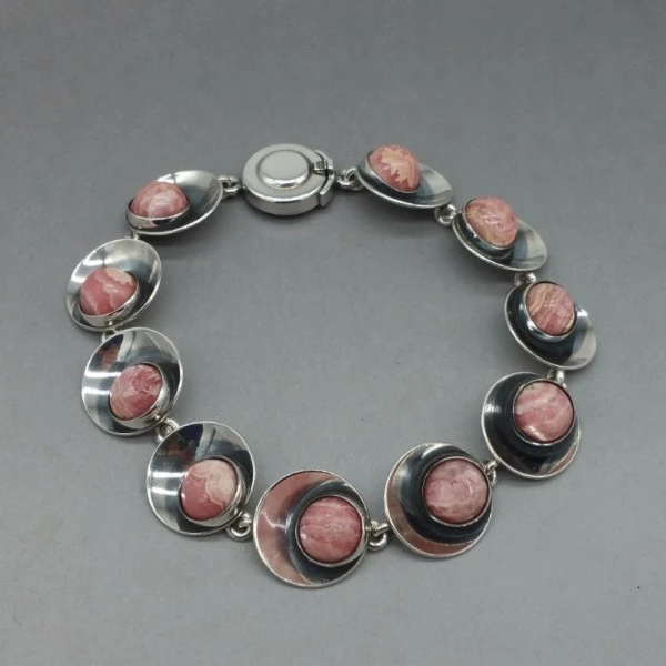 Stunning Niels Erik From (N.E.From ), Denmark, vintage rhodolite and sterling silver bracelet with circular gems bezel set in silver cup settings. The bracelet has a silver circular box clsp closure. The rear of the closure is signed with "NE FROM, 925 S, STERLING, DANMARK ". It measures approximately 19 cm (7.5 inches) . Weight is 27 grams It is in very good condition. Estimated to date from 1950's to 1960's