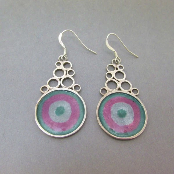 These are lovely pair of vintage sterling silver and enamel earrings by Scottish Designer Norman Grant. They comprise a series of circular silver bubble type details at the top of the earrings, and below this there is a circular silver and enamel part which has circular turquoise and pink enamel rings .The earrings are made of sterling silver and enamel and the rear of each earring is clearly marked with the letters "NG" and silver hallmarks. The hallmarks date the earrings to Edinburgh and 1973. Each earring measures approximately 4 cm long (from the top of the silver "bubbles" ) x 2cm wide (at the widest part). The circular enamel section is approximately 2.1cm in diameter, and the earrings are in very good vintage condition.