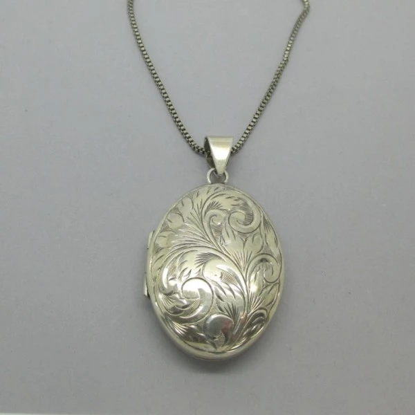 Lovely oval shaped vintage sterling silver locket with engraved floral design to the front. It is openable and measures approximately 3.8 x 2.9 cm not including the pendant bail. It has the signature "FBROS" and silver hallmarks on the rear of the locket for Bimingham 1979. It has a sterling silver chain that measures approximately 26 inches, (66 cm) . The locket has minor signs of wear commensurate with age, but is generally in very good vintage condition.