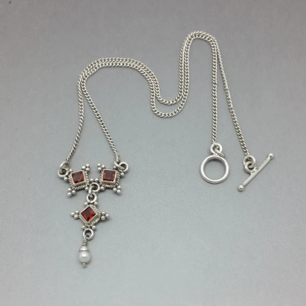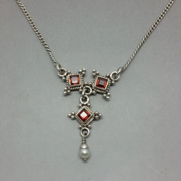 Pretty and detailed vintage red garnet and sterling silver necklace. It has 3 small diamond shaped deep red garnet stones bezel set in dainty sterling silver settings with a small pearl dop below. It is marked 925 on the rear. It has a 15.5 inch (39 cm) sterling silver curb chain with a toggle clasp closure. The detailed part (red garnet and pearl) measures approximately 2 cm wide x 3.4 cm. It is in very good vintage condition.