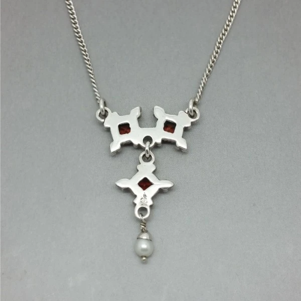 Condition: Very Good Colour/Gemstone: Red Garnet, Pearl and Silver Metal: Sterling Silver Size: 2 x 3.4cm with 15.5 inch (39 cm) chain Era: