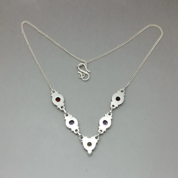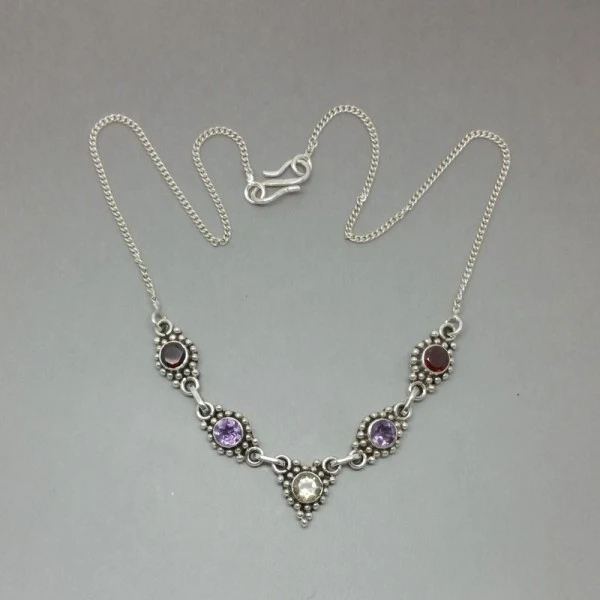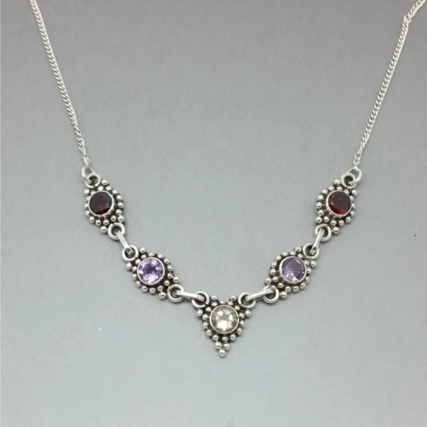Condition: Very Good Colour/Gemstone: Amethyst, garnet, citrine Metal: Sterling Silver Size:16 inch chain (41cm) Era: