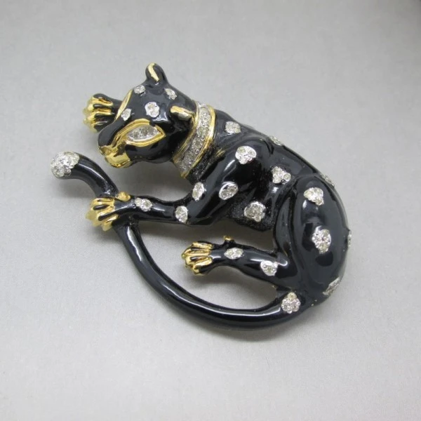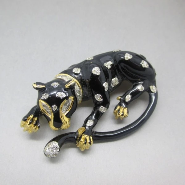 This is a rare and gorgeous vintage black enamel and crystal panther brooch by Vogue Bijoux. Vogue Bijoux is an Italian company that made high quality costume jewellery from 1950s to early 1990s. This brooch is beautifully detailed ( in particular the paws and face), with black enamel on a gold tone base and small crystal details making up the spots and eyes. It measures approximately 5.3 cm long x 3.3 cm wide (at widest part) and has a rollover C clasp pin closure. The rear of the brooch is signed with "VOGUE Bijoux" . It is in excellent condition Condition: Execllent Colour: Black,gold,crystal Metal: Goldtone Size: 5.3 cm long x 3.3 cm wide (at widest part) approximately Era: 1970's to 1980's