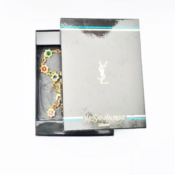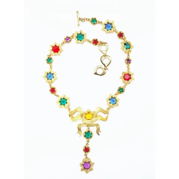 This is an absolutely stunning and rare vintage 1980's Yves Saint Laurent necklace. It is a round style necklace with extension drop and comprises a series of interlinking openbacked multi colour crystal star cabochons in gold tone settings. The necklace has a gold tone toggle clasp closure and and measures approximately 17 inches (43cm), however it is extendable to 19 inches (48 cm ) at full extension. The drop part measures approximately 3.5 inches (9cm) long.The 3 gold tone cabochons near the toggle are marked with "Yves Saint Laurent" and the rear of the toggle is marked with "Made in France". The necklace is in excellent condition and appears unworn. It comes with the original YSL box. This is a much sought after beautiful quality Yves Saint Laurent vintage costume necklace and is estimated to date from the 1980's.