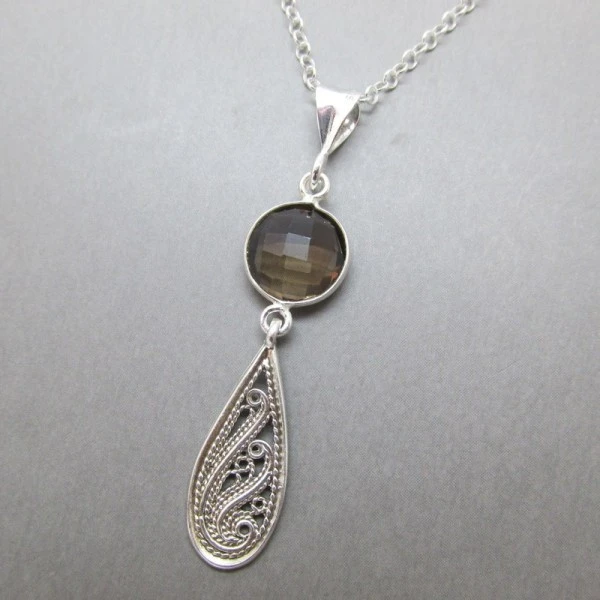 This necklace has a faceted circular smokey topaz quartz connector in a sterling silver bezel setting with a detailed sterling silver pendant drop below. The pendant has a sterling silver pendant bail, and a sterling silver chain. The smokey topaz connector measures 1.cm approximately in diameter and the pendant drop length (from the top of the bail ) is approximately 4.7 cm. The chain length is approximately 16 inches (41cm).