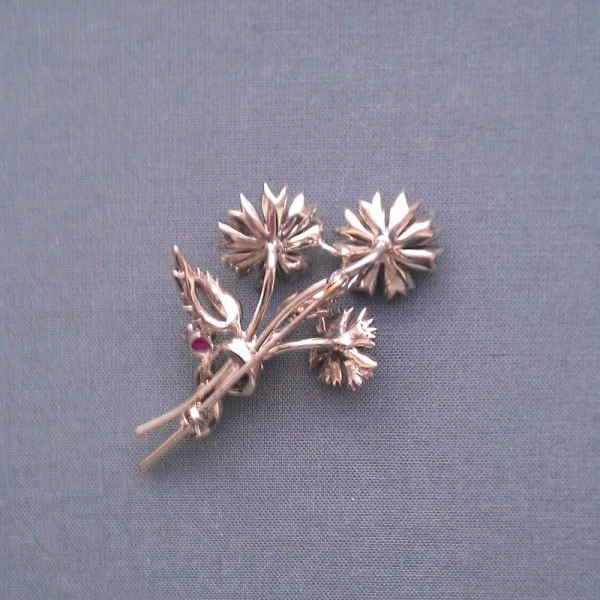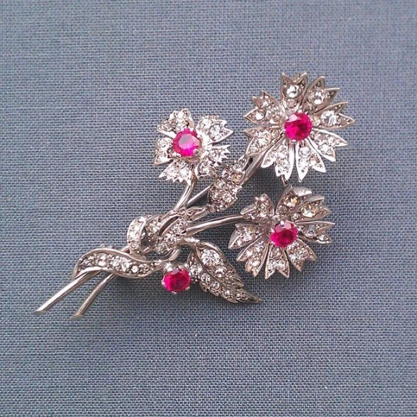 This stylish sterling silver vintage brooch has an intricately detailed silver leaf and flower design. The flower petals and leaves are set with sparklng small clear crystals and each flower has a small central prong set deep pink crystal sparkling amongst the silver petals