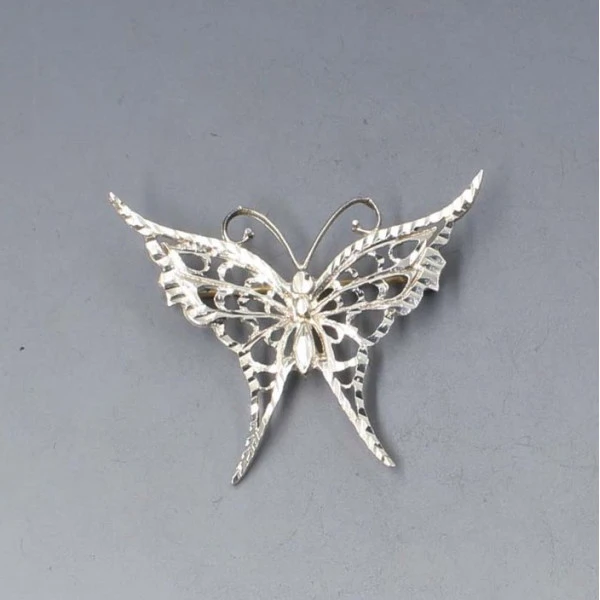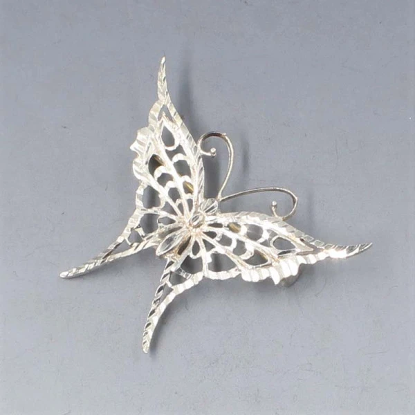 Vintage sterling silver butterfly brooch. It has a pin and rollover C clasp closure to the rear. It is marked "SILVER" on the rear. The brooch measures approximately 4.3 cm x 3.6 cm. Weight is 4 grams. It is in very good condition