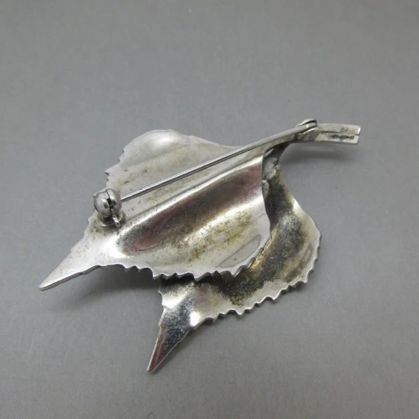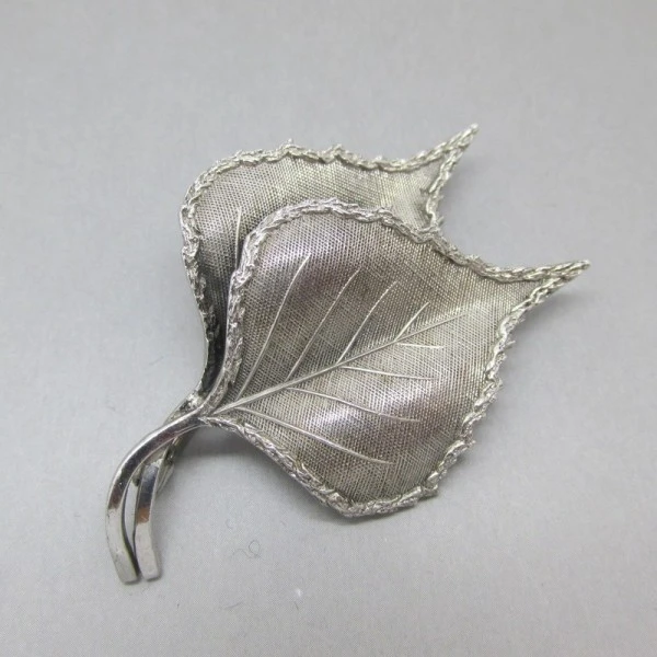 This stylish vintage sterling silver leaf brooch has an unusual double leaf design with beautiful detailing. It measures approximately 5cm long x 3.3cm wide and has a rollover C clasp pin closure to the rear. It is in good vintage condition and is stamped "925 for sterling silver on the rear as well as having some additional indistinct silver hallmarks. Condition: Good Colour: Silver Metal: Sterling Silver Size: 5 cm long x 3.3 cm wide approximately Era: Unknown- hallmarks indistinct