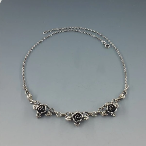 Beautiful TEKA, Germany, 1970's sterling silver roses necklace. It has a detailed silver rose and leaf design. The rear of the necklace is marked "925 TEKA" and it has a spring ring closure. It measures approximately 45 cm (18 inches). Weight is 11.8 grams. It is in very good condition and is estimated to date from the 1970's. TEKA was founded by Theodor Klotz a German silversmith. Condition: Very Good Colour/Gemstone: Silver Metal: Sterling Silver Size: 45 cm (18 inches) Weight: 11.8 grams Era: Estimated 1970's