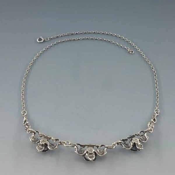 Vintage Hans Julius Larsen, Denmark 830 silver art nouveau style necklace. The necklace has a series of floral art nouveau style links and an 830 silver hook clasp closure. It is signed with makers marks "JL" and "830S". It measures approximately 16.5 inches (42 cm). Weight is 43 gra..