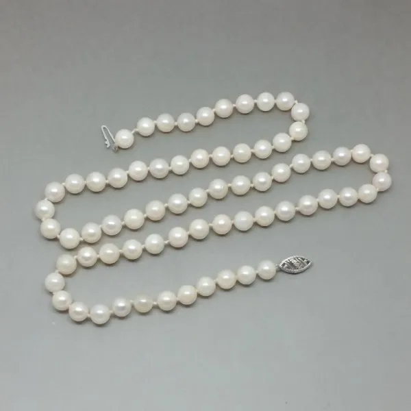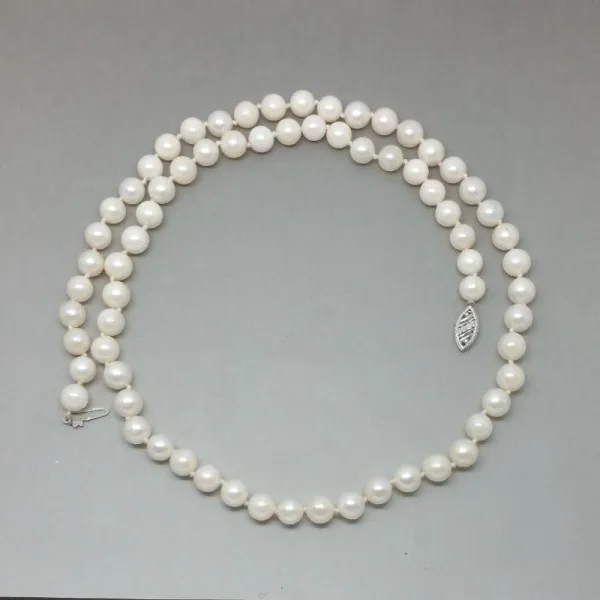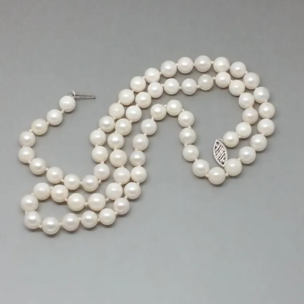 A beautiful and classic vintage pearl round necklace with luminous regular sized round light cream/white pearls.The necklace closes with a decorative 14 carat white gold clasp. The pearls each measure approximately 5mm in size and are regular in shape. The necklace is in excellent condition and measures approximately 19 inches (48 cm ).