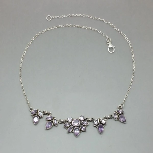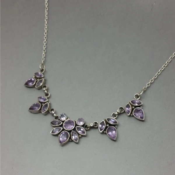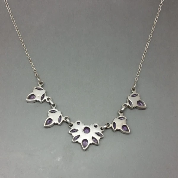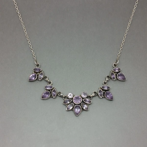 Very pretty and elegant vintage amethyst solid sterling silver necklace. The necklace has a series of flower petal design links comprising small oval amethyst gems bezel set in sterling silver settings It has a sterling silver chain with lobster clasp closure marked "925" for sterling silver The necklace measures approximately 15.75 inches (40cm). It is in good vintage condition with small signs of wear commensurate with age