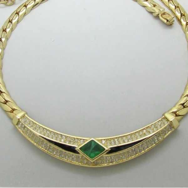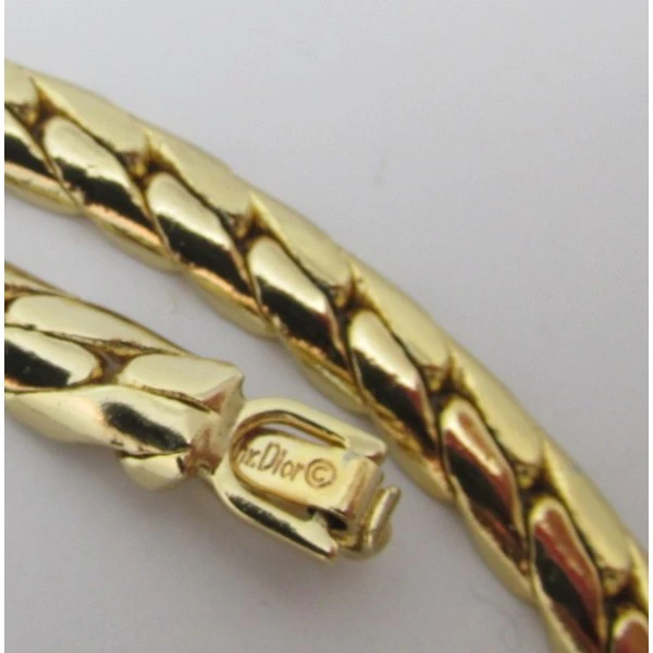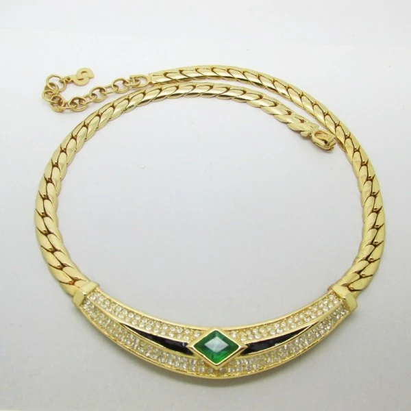 This is a stylish vintage Christian Dior necklace. The necklace has a green diamond shaped crystal focal point with black enamel and clear crystal details either side. The necklace has a flat goldtone snake chain with a foldover closure. The necklace chain has the CD logo and it is marked with CH Dior on the rear of the clasp. The necklace measures approximately 15 inches (38cm) but has a 2 inch extension chain allowing the necklace to extend to 17 (43cm) inches if required. The necklace is in excellent condition. Condition: Excellent Colour/Gemstone: Green , clear crystal and black Metal: GoldToneSize: 15 to 17 inches (38 to 43cm) Era: 1980's