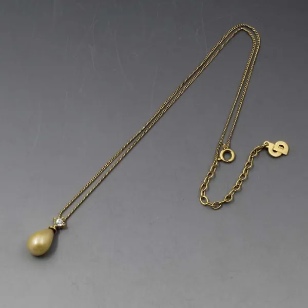 This is a lovely vintage Christian Dior pearl pendant necklace. The pendant comprises a small clear crystal prong set in a gold tone setting with a faux pearl drop below. The necklace has a gold tone chain with the CD logo. The necklace has a springring necklace fastening and measures aproximately 15 inches (38cm) but has a 2 inch extension chain allowing the necklace to extend to 17 (43cm) inches if required. The necklace is in very good condition. This is a great quality vintage Dior pearl pendant necklace dating approximately from the 1970's which would make a stylish addition to an outfit.
